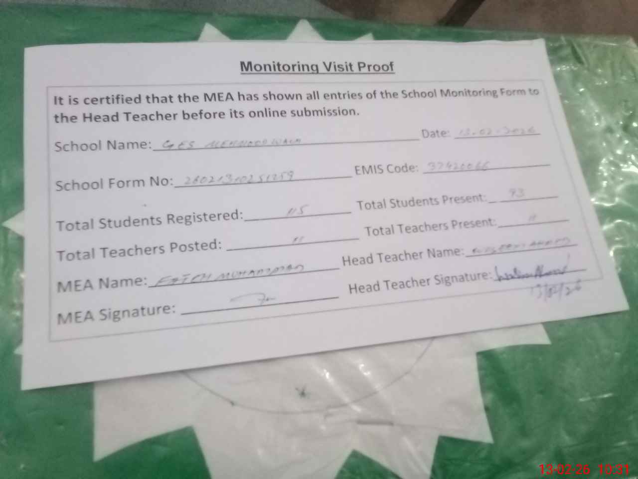| Attendance Register | Head Teacher | MEA with School | Visit Proof |