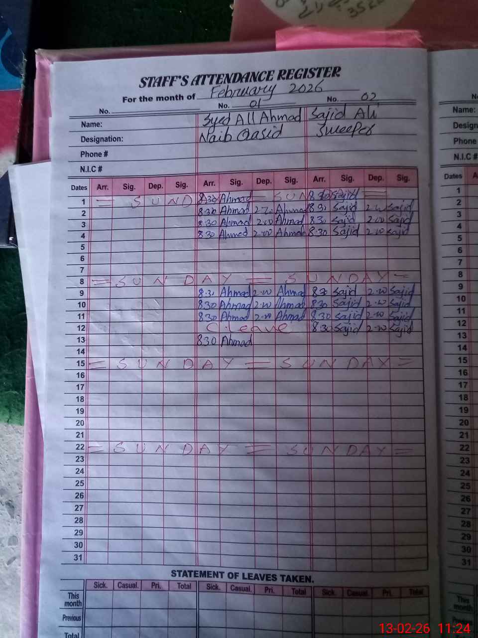 | CNIC | Full Name | Designation | R/C | Absence During Last Calender Month |