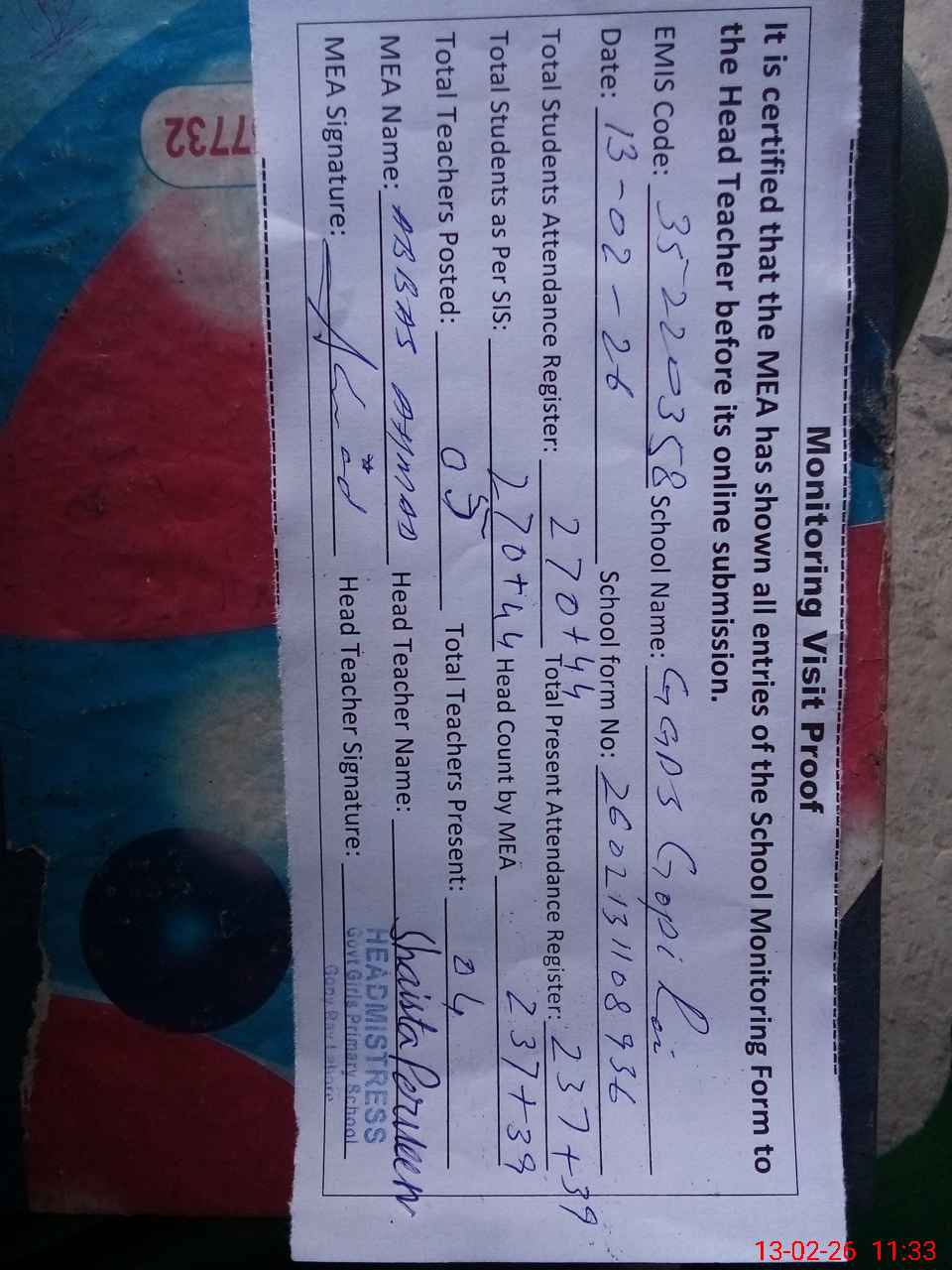 | Attendance Register | Head Teacher | MEA with School | Visit Proof |