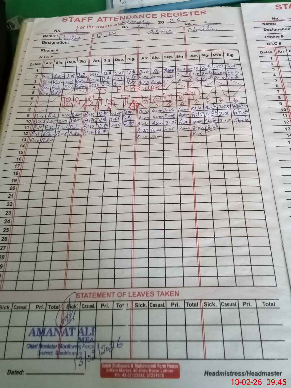 | CNIC | Full Name | Designation | R/C | Absence During Last Calender Month |