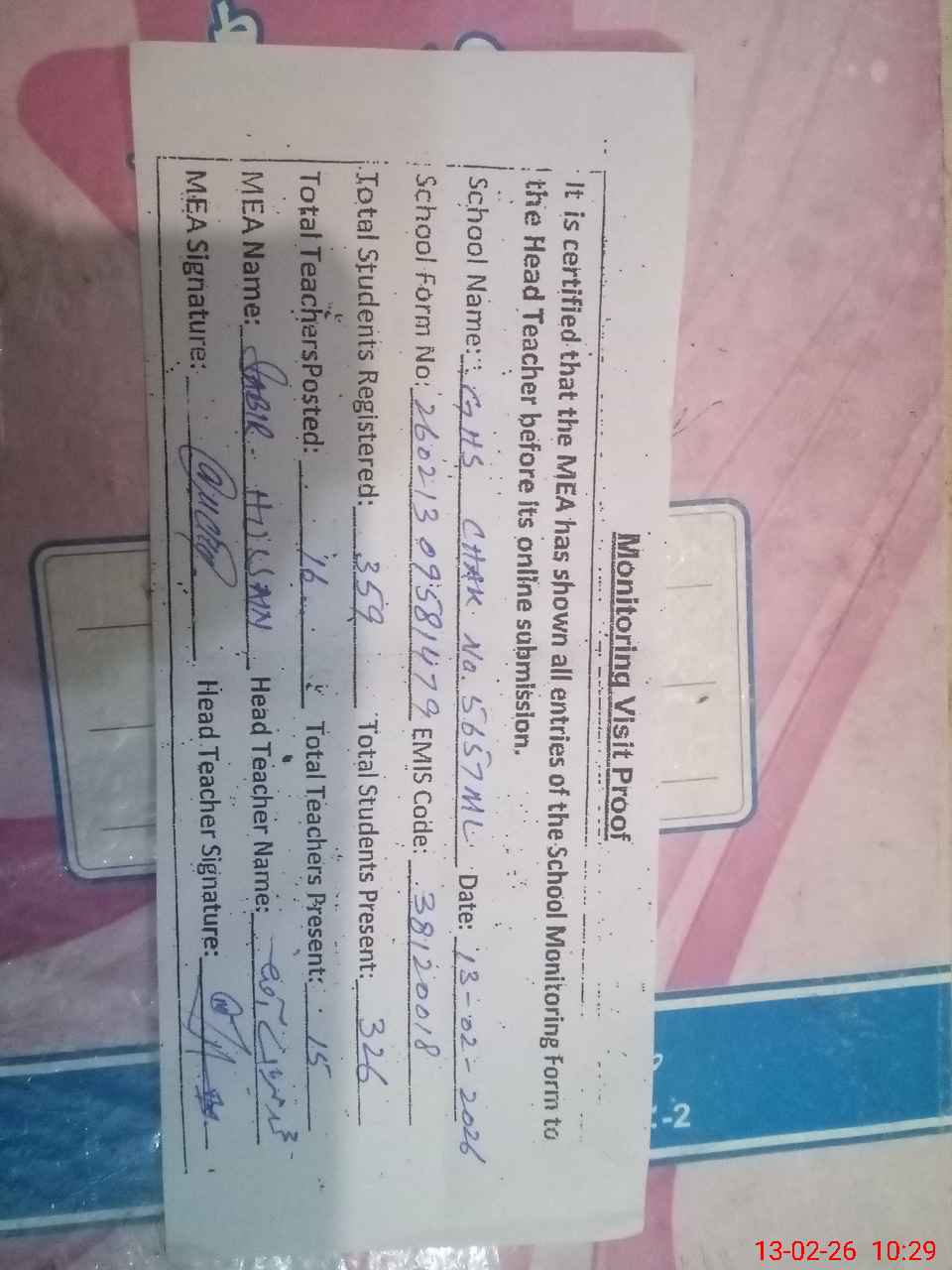 | Certified that this School was Inspected by the Undersigned MEA/DMO Today and the Information Stated Above is as Per Record. | |||||