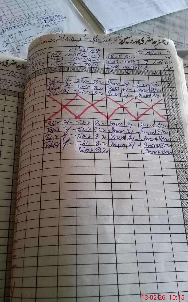 | CNIC | Full Name | Designation | R/C | Absence During Last Calender Month |