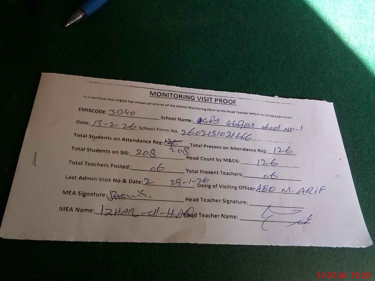 | Attendance Register | Head Teacher | MEA with School | Visit Proof |