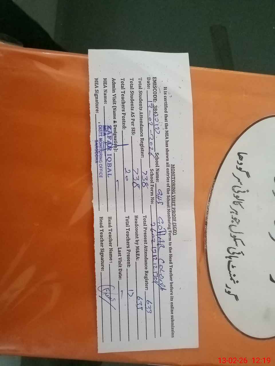 | Attendance Register | Head Teacher | MEA with School | Visit Proof |