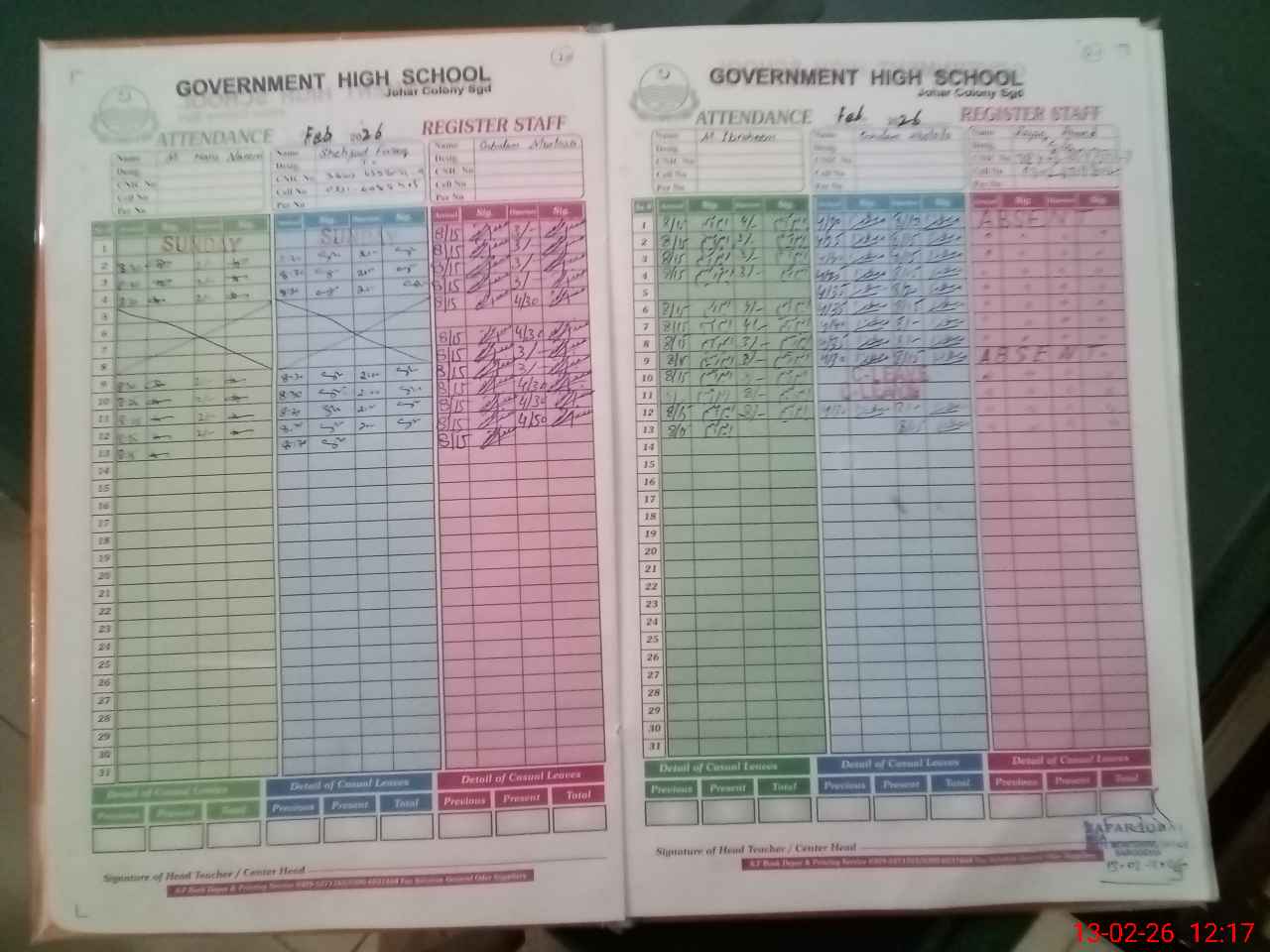 | CNIC | Full Name | Designation | R/C | Absence During Last Calender Month |