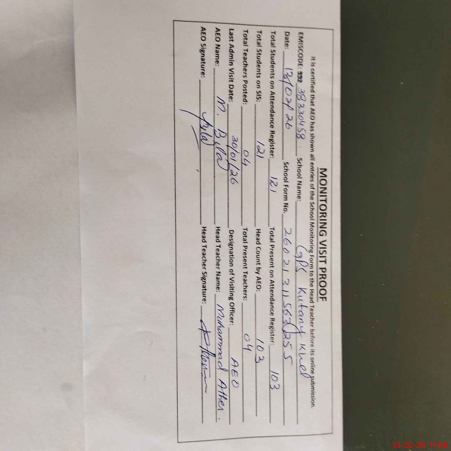 | Attendance Register | Head Teacher | MEA with School | Visit Proof |