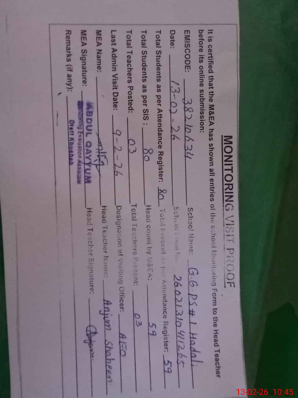 | Attendance Register | Head Teacher | MEA with School | Visit Proof |