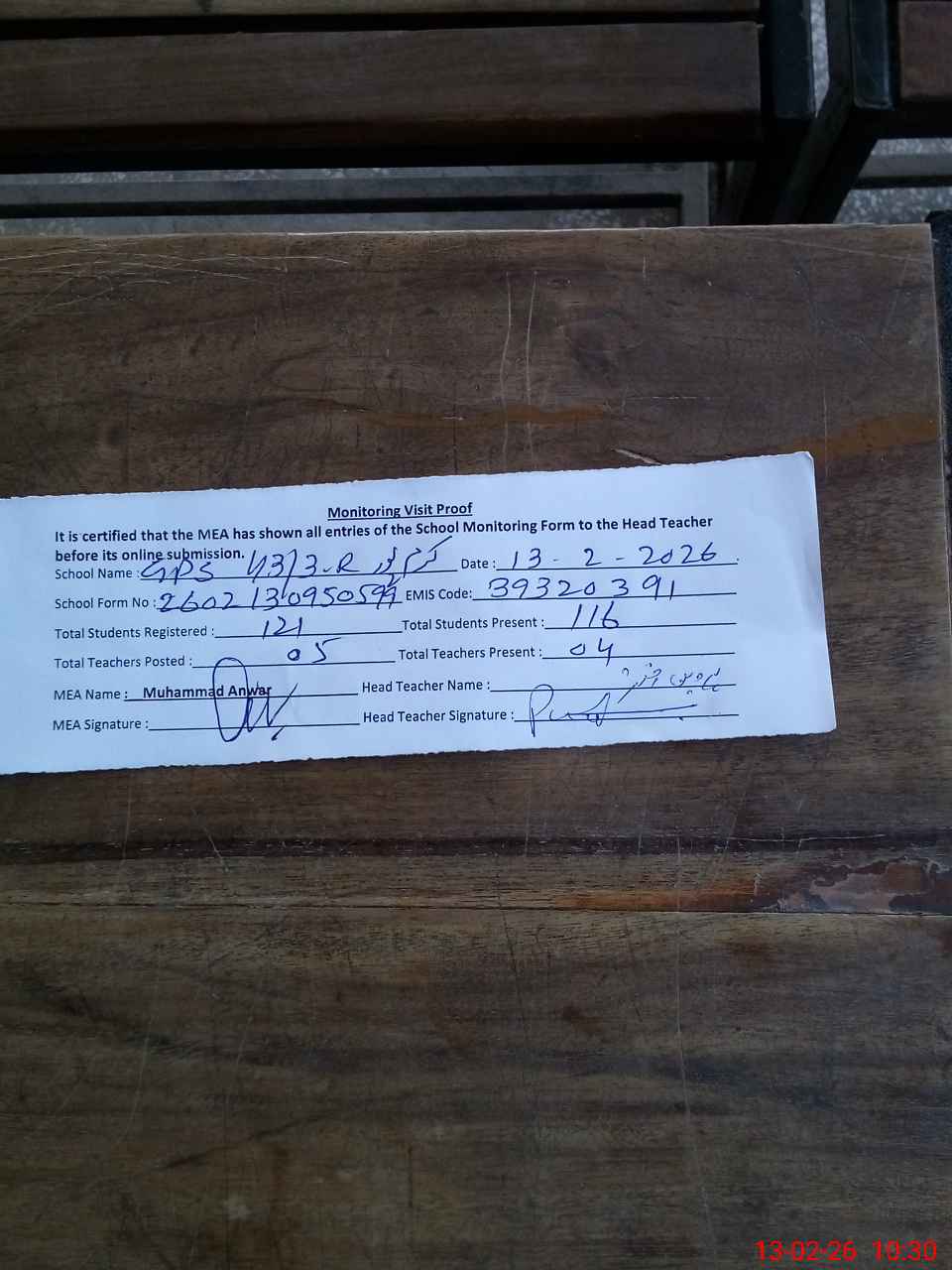 | Attendance Register | Head Teacher | MEA with School | Visit Proof |