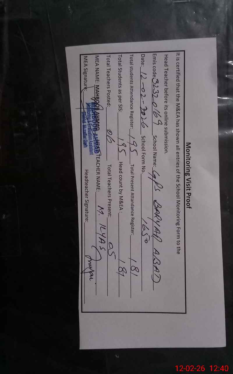 | EMIS Code: 32320169 | Name of School: GPS BARYAR ABAD | |||