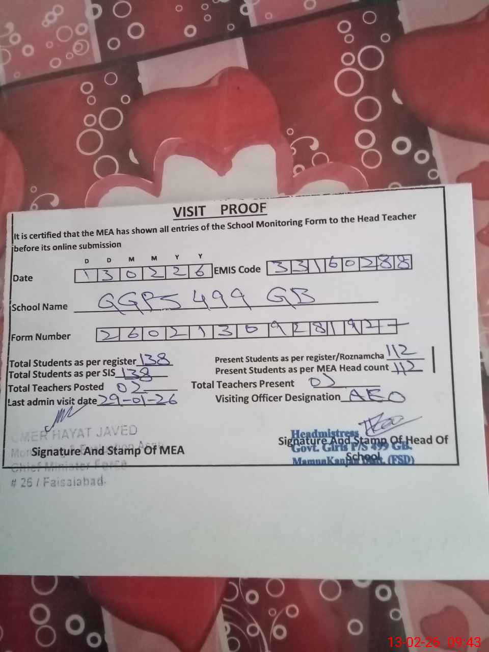 | EMIS Code: 33160288 | Name of School: GGPS CHAK 499 GB MAMUNKANJAN | |||