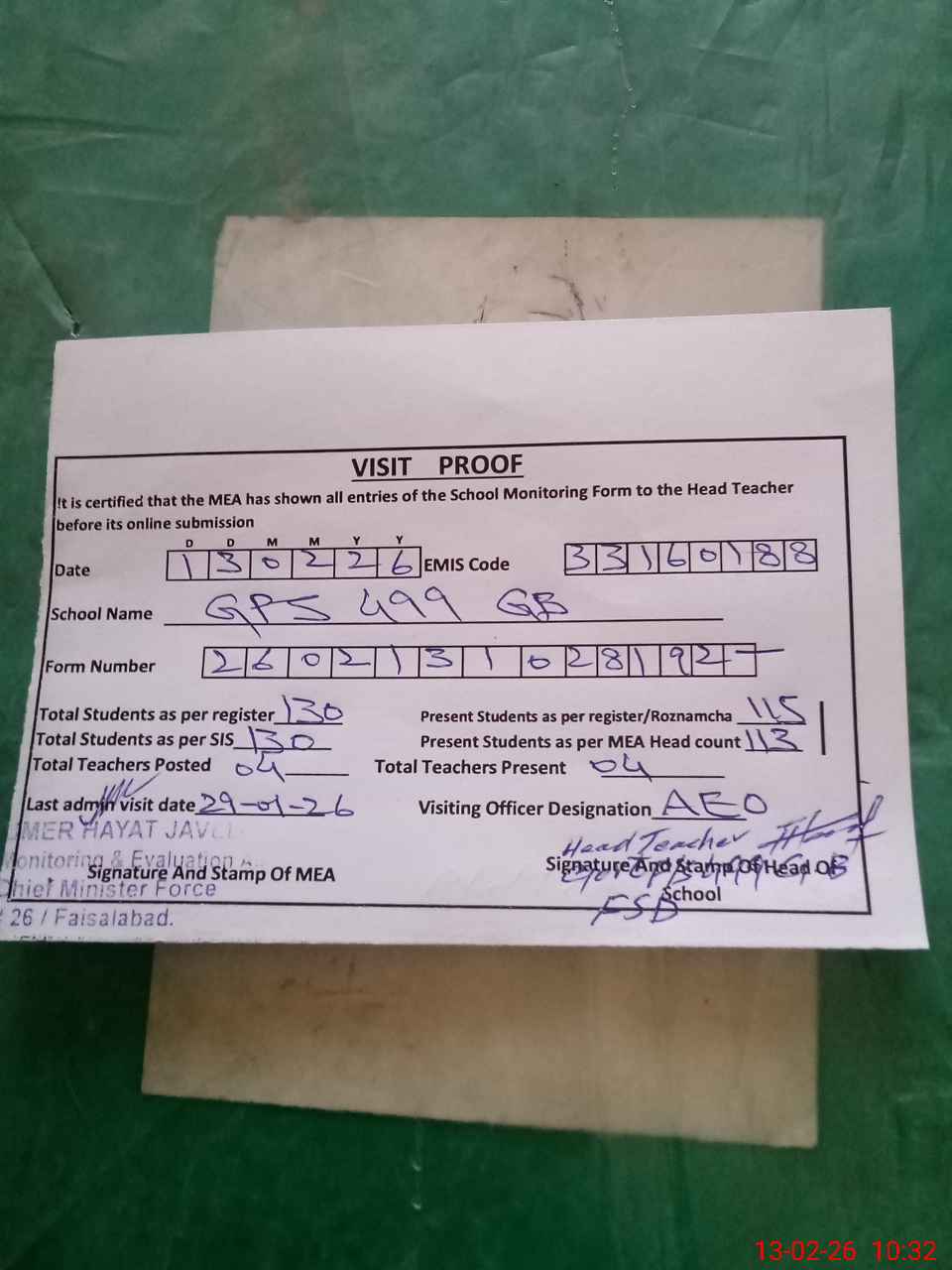 | EMIS Code: 33160188 | Name of School: GPS CHAK 499 GB TANDLIANWALA | |||