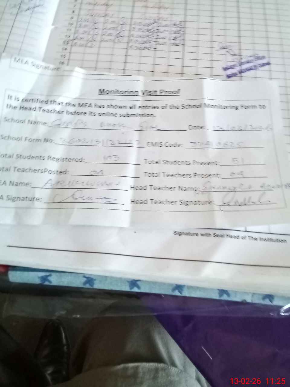 | Attendance Register | Head Teacher | MEA with School | Visit Proof |