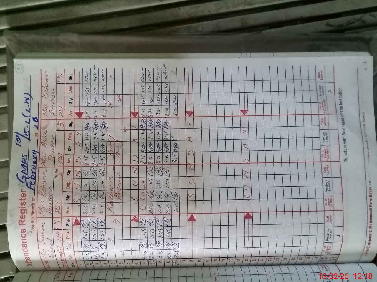 | No. of Students Present - Female | 0 | 18 | 32 | 33 | 32 | 26 | 26 | 194 | ||||||||