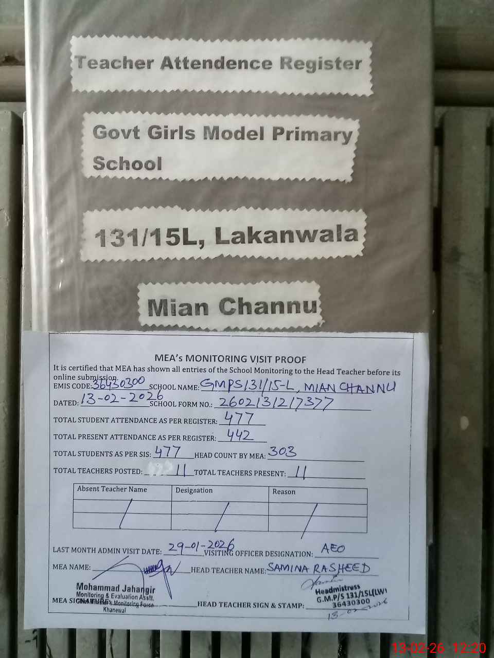 | Attendance Register | Head Teacher | MEA with School | Visit Proof |