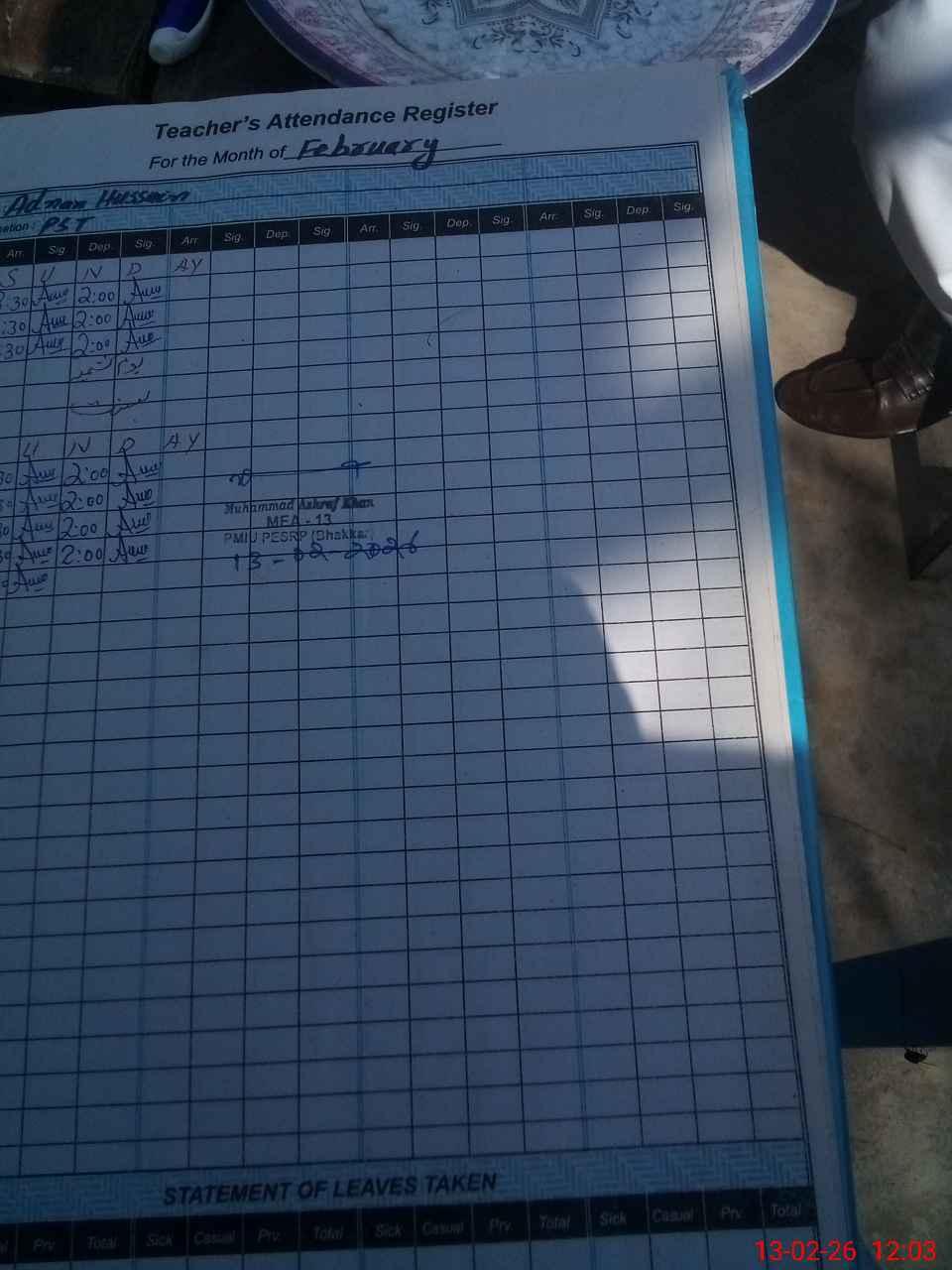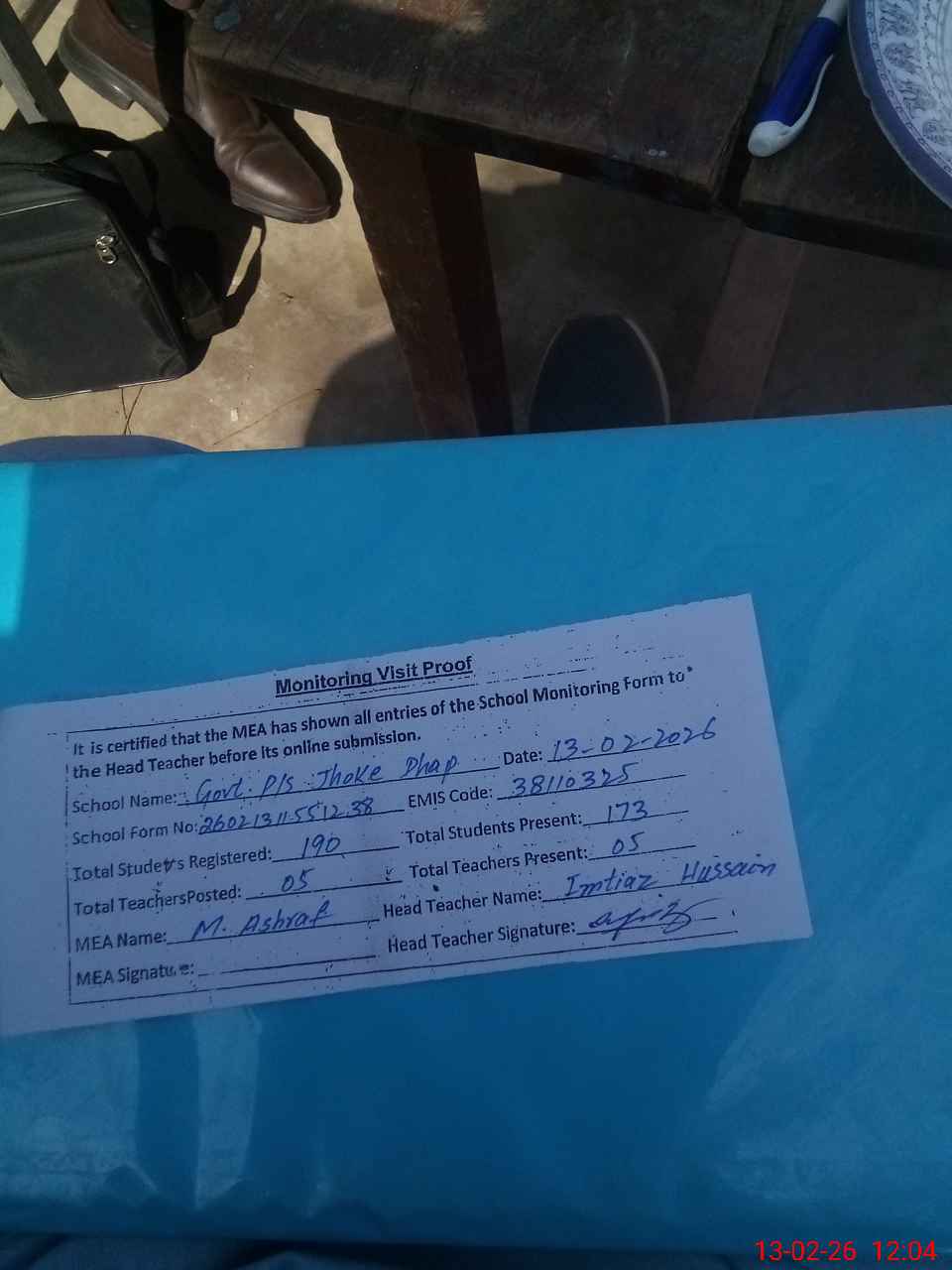 | Attendance Register | Head Teacher | MEA with School | Visit Proof |
