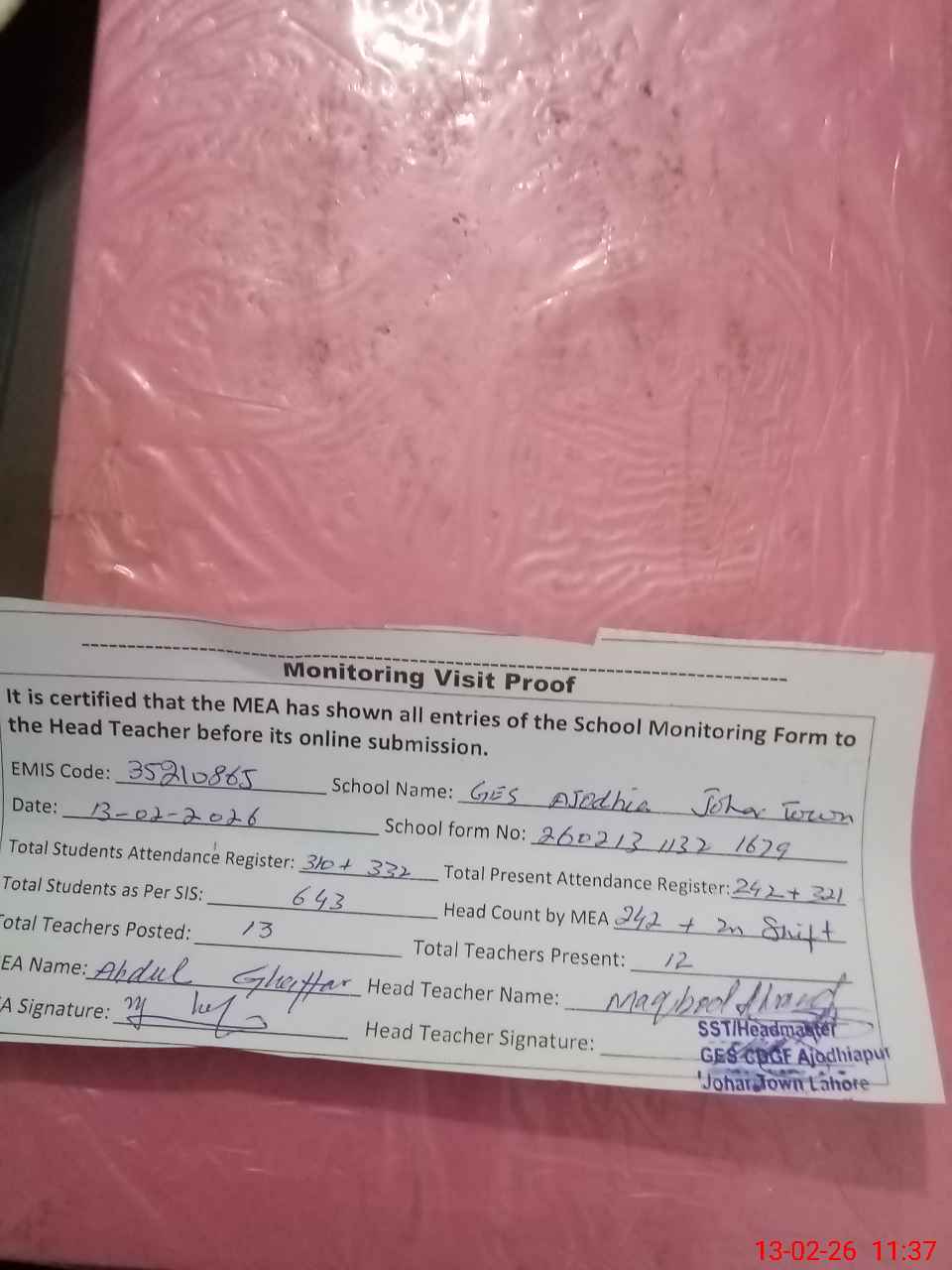 | EMIS Code: 35210865 | Name of School: GES AJODHIA PUR JOHAR TOWN (EX-MCL) | |||