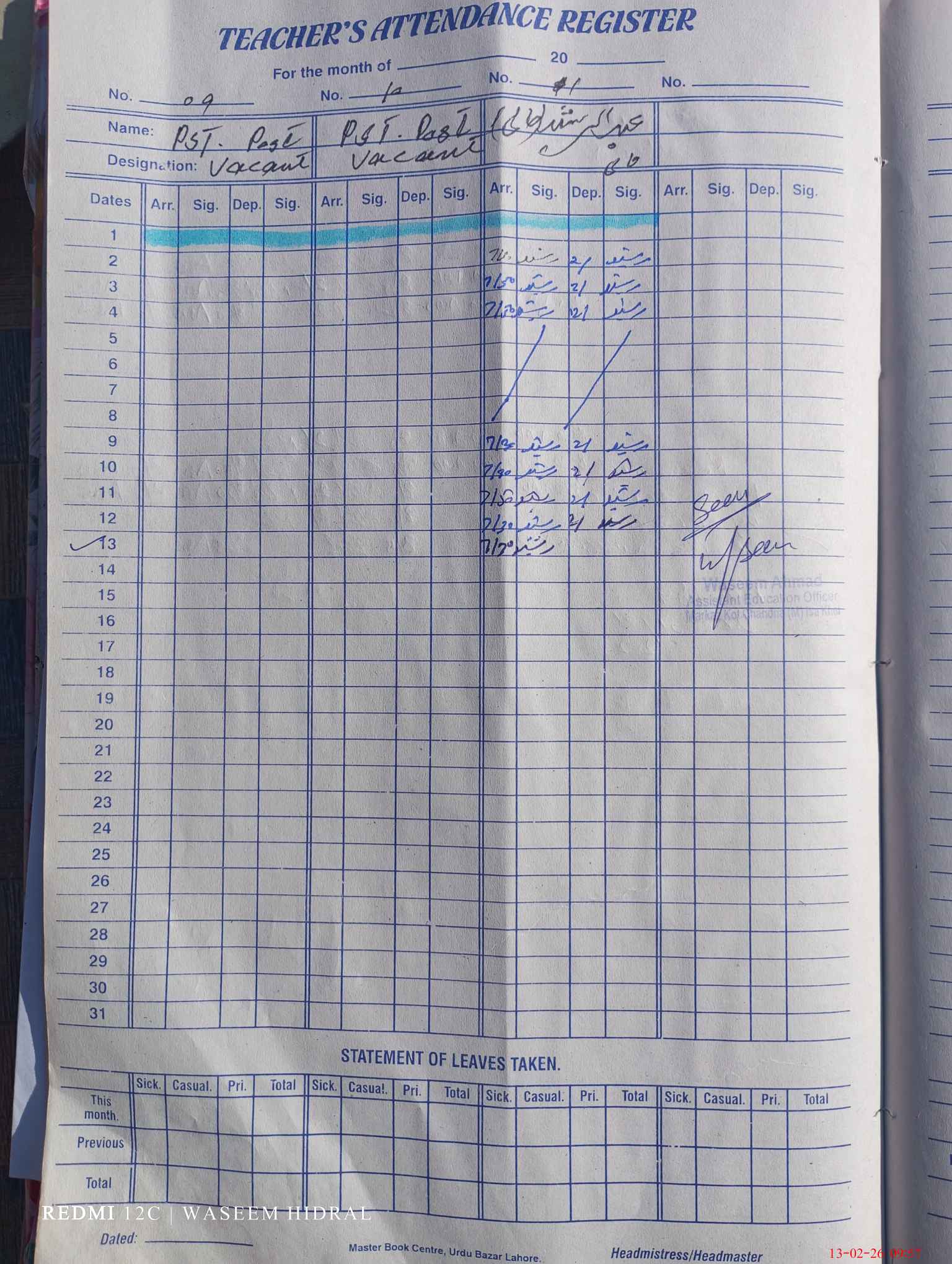 | Name: Mu**** Di**** Designation: (School Headmaster's/Headmistress's) EST Phone/Cell Number: 03**** |