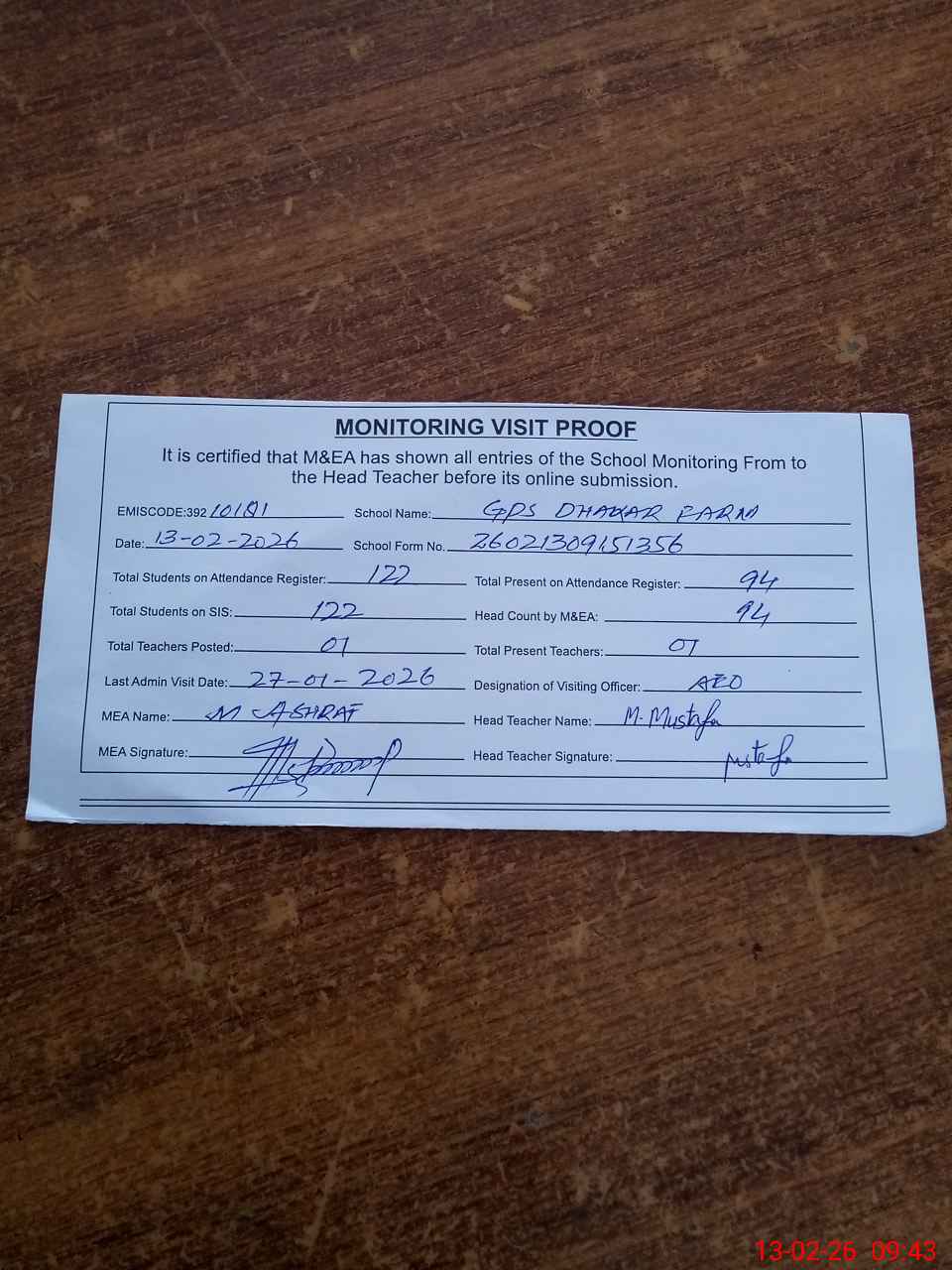 | EMIS Code: 39210181 | Name of School: GPS DHAKAR FARM PO PAKPATTAN | |||