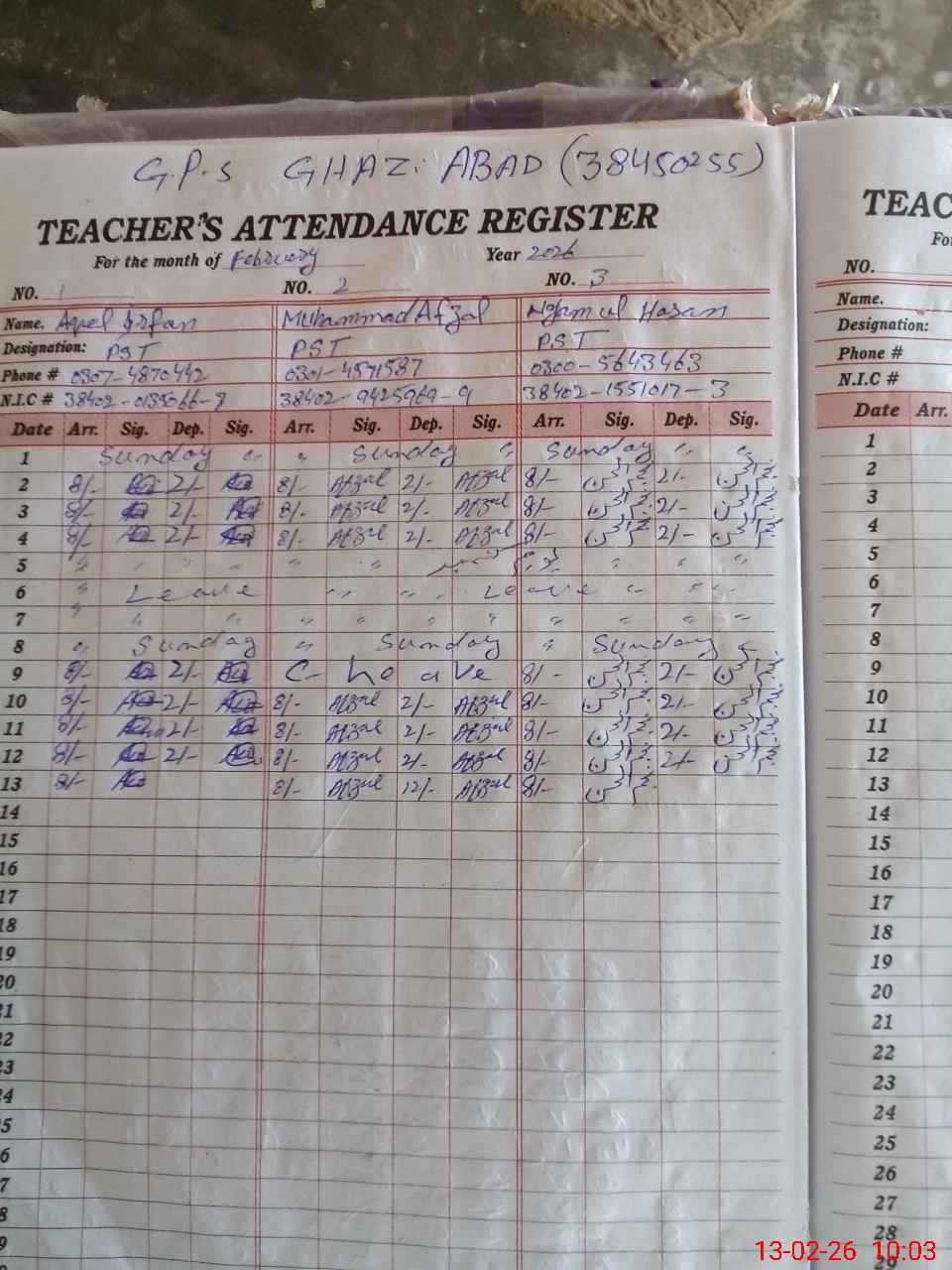| CNIC | Full Name | Designation | R/C | Absence During Last Calender Month |