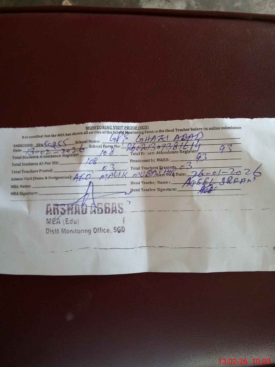 | Attendance Register | Head Teacher | MEA with School | Visit Proof |