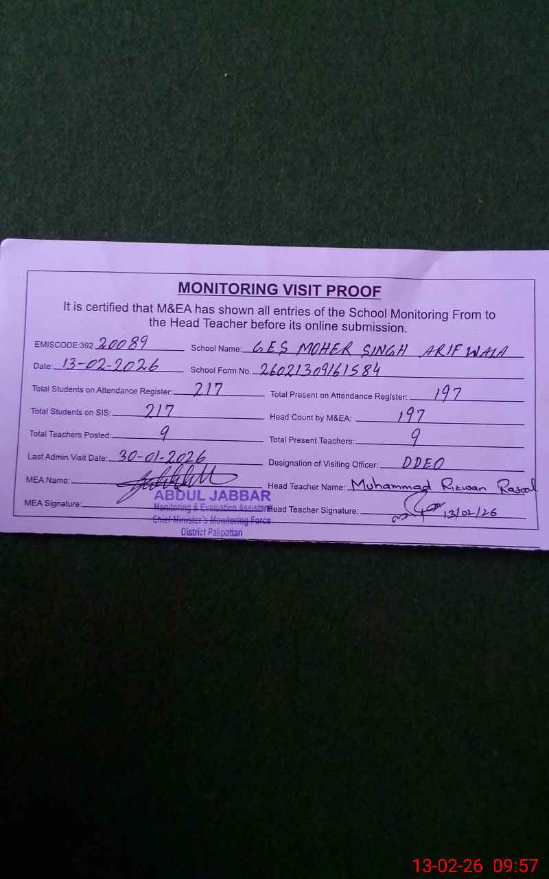 | EMIS Code: 39220089 | Name of School: GES MOHER SINGH ARIFWALA | |||