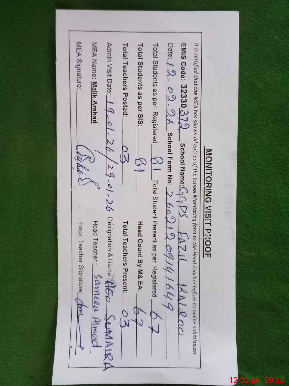 | Attendance Register | Head Teacher | MEA with School | Visit Proof |