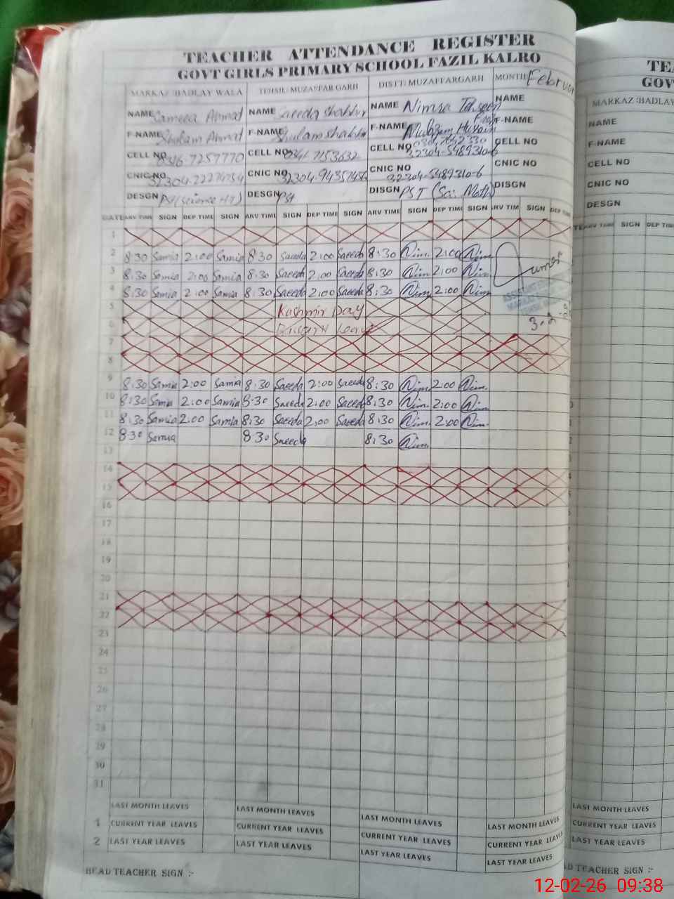 | CNIC | Full Name | Designation | R/C | Absence during last cal. month |