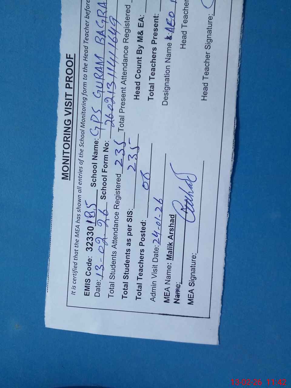 | Attendance Register | Head Teacher | MEA with School | Visit Proof |
