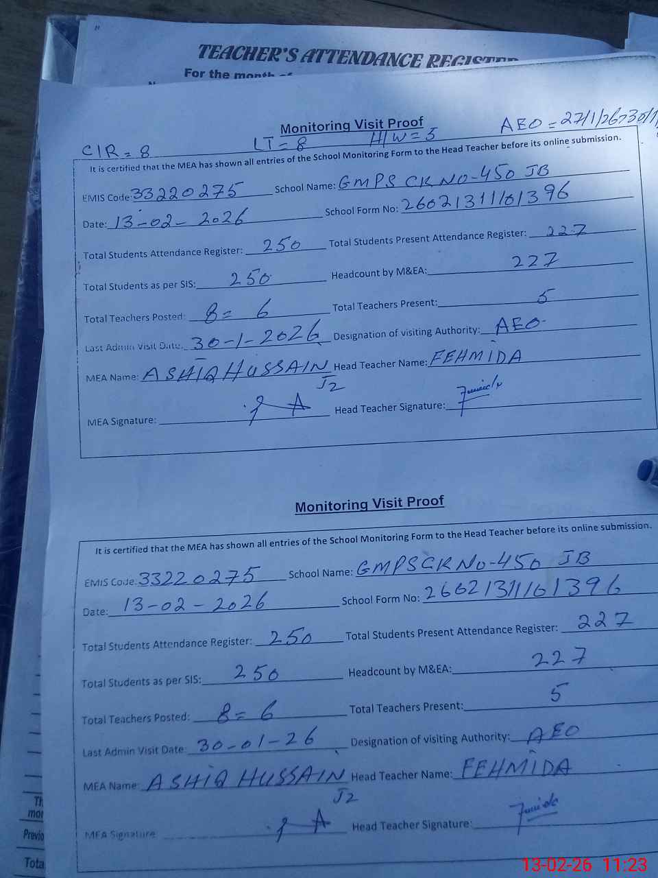 | Attendance Register | Head Teacher | MEA with School | Visit Proof |
