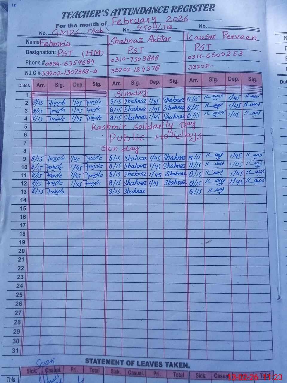 | Name: FE**** Designation: (School Headmaster's/Headmistress's) PST Phone/Cell Number: 03**** |