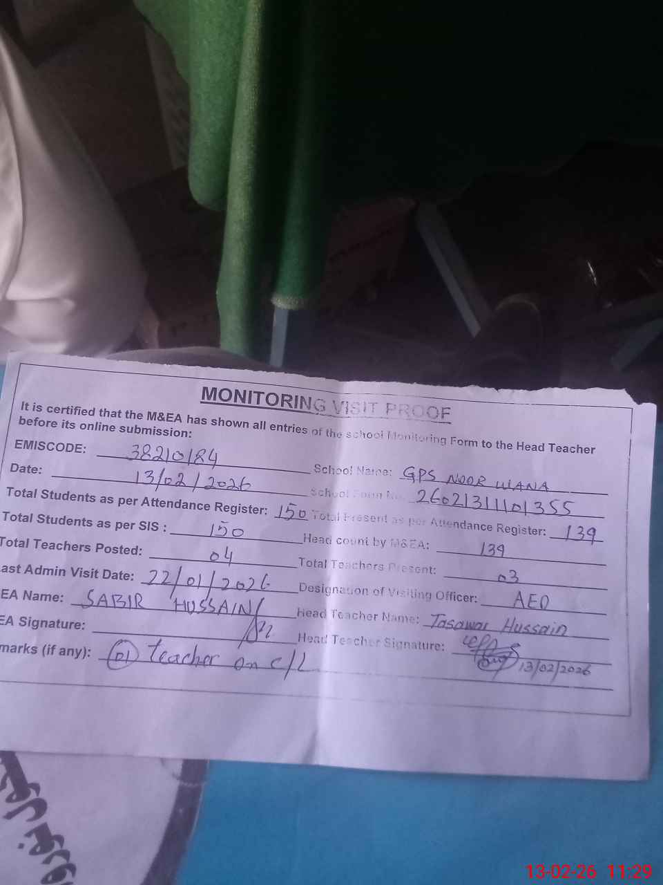 | Remarks (Use Separate Page if Required): no teacher absent total students on register 150 total students on SiS 150 last admin visit by AEO on 22 Jan 2026 | |||||