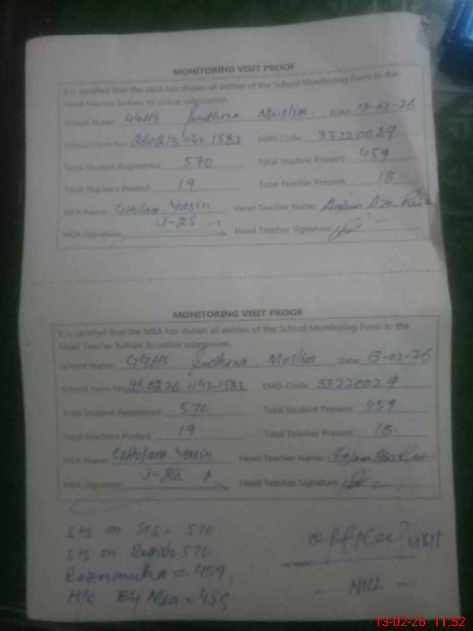 | Attendance Register | Head Teacher | MEA with School | Visit Proof |