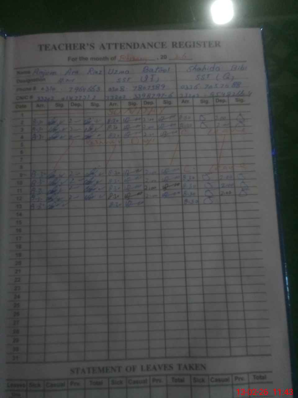 | CNIC | Full Name | Designation | R/C | Absence During Last Calender Month |