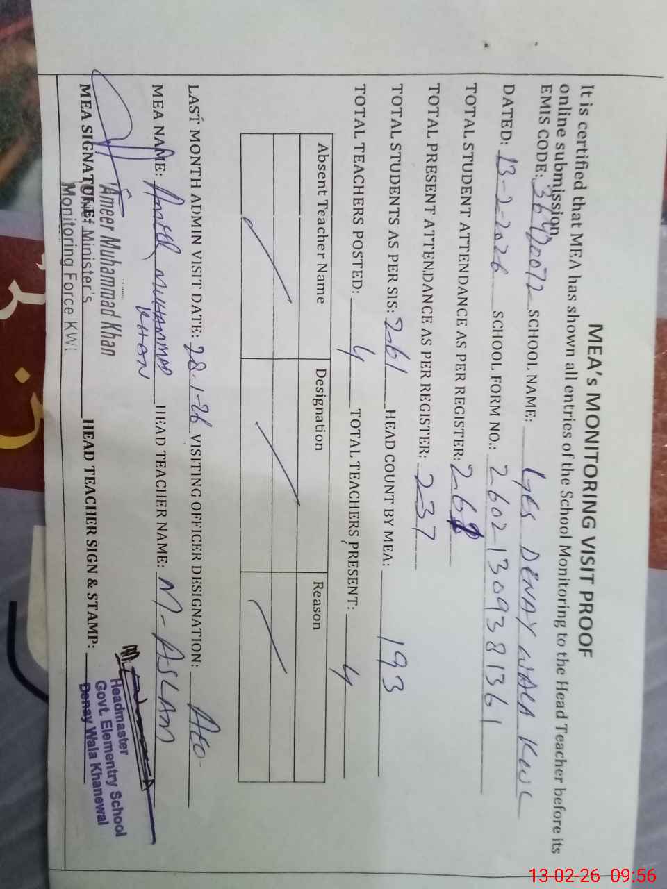 | Attendance Register | Head Teacher | MEA with School | Visit Proof |