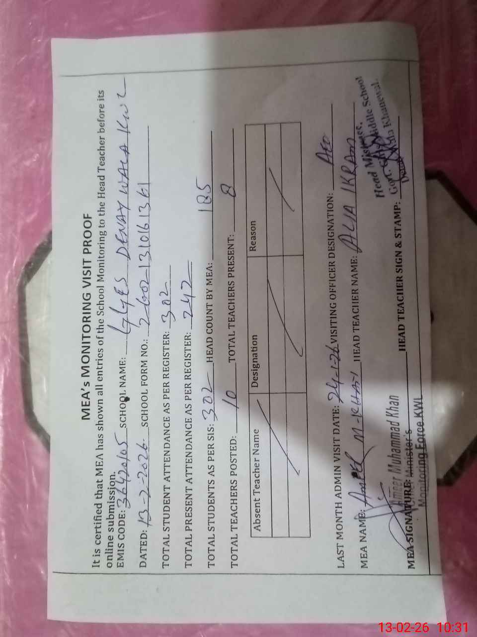 | Attendance Register | Head Teacher | MEA with School | Visit Proof |