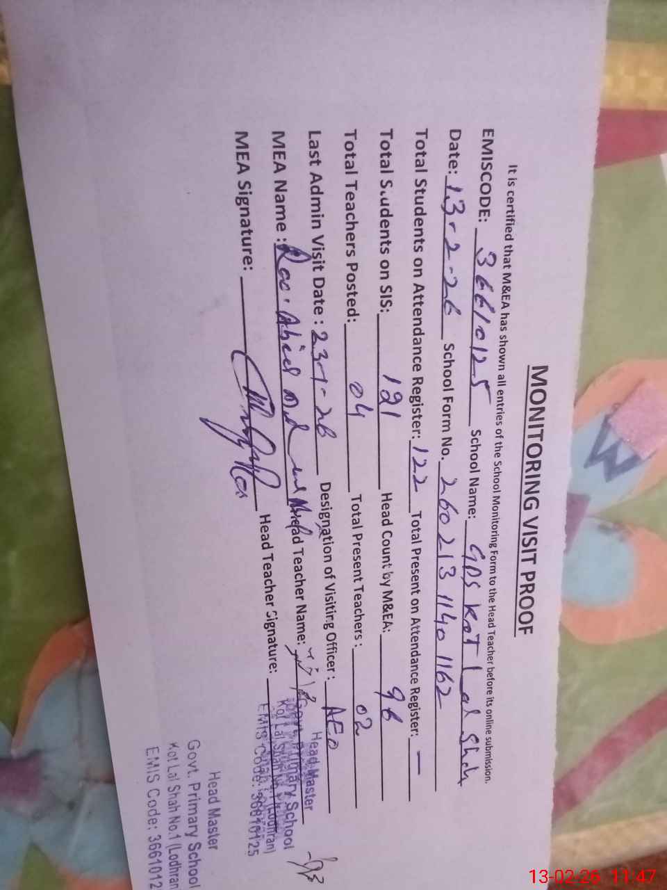 | Attendance Register | Head Teacher | MEA with School | Visit Proof |