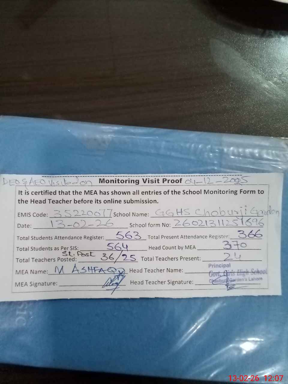 | EMIS Code: 35220077 | Name of School: GGHS CHOBURJI GARDEN | |||