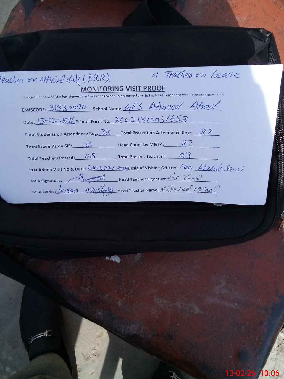 | Attendance Register | Head Teacher | MEA with School | Visit Proof |