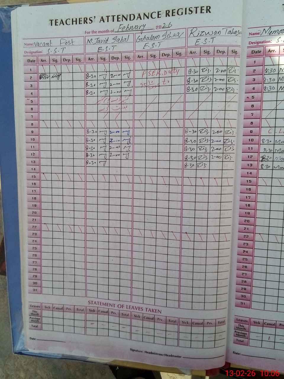 | Leave | Duty | Absent | Maternity | Medical | Ex- Pak |