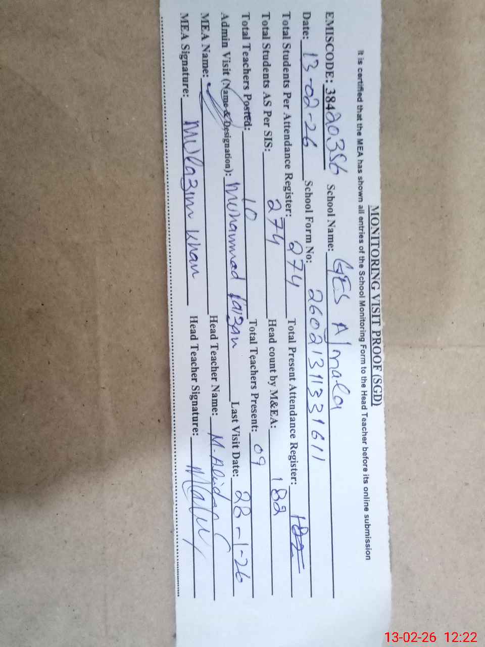 | Attendance Register | Head Teacher | MEA with School | Visit Proof |