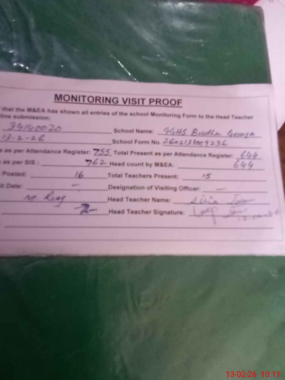 | Attendance Register | Head Teacher | MEA with School | Visit Proof |