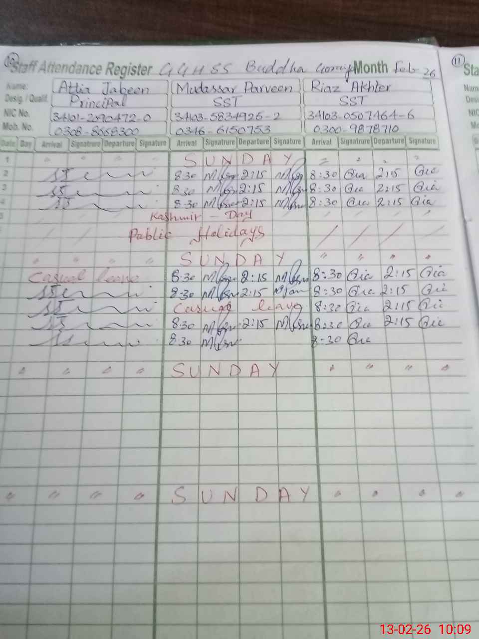 | CNIC | Full Name | Designation | R/C | Absence during last cal. month |