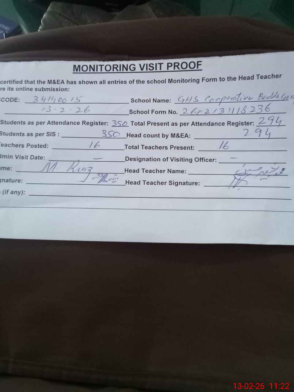 | EMIS Code: 34140015 | Name of School: GHS CO-OPERATIVE BUDHA GORAYA | |||
