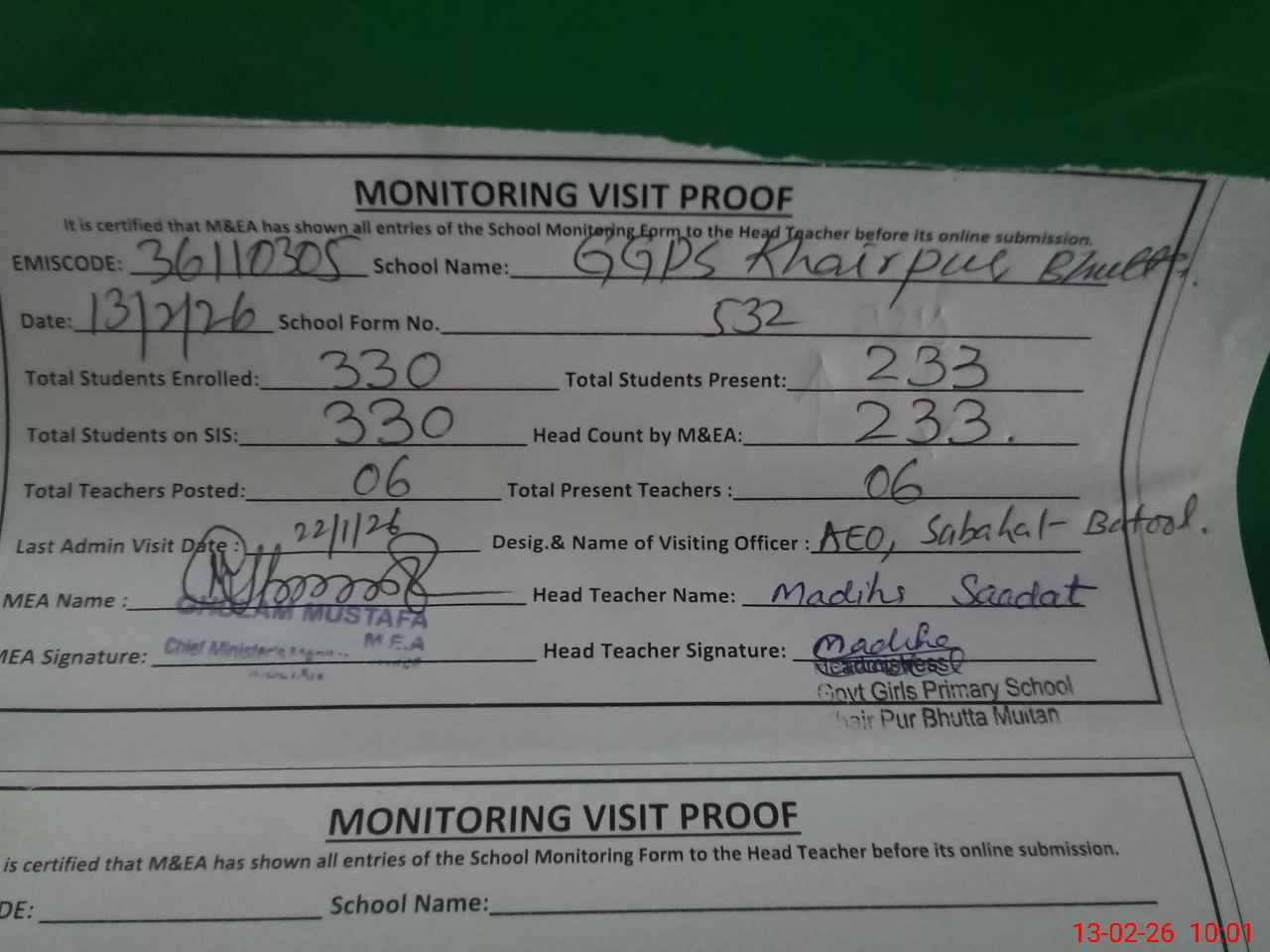 | Certified that this School was Inspected by the Undersigned MEA/DMO Today and the Information Stated Above is as Per Record. | |||||