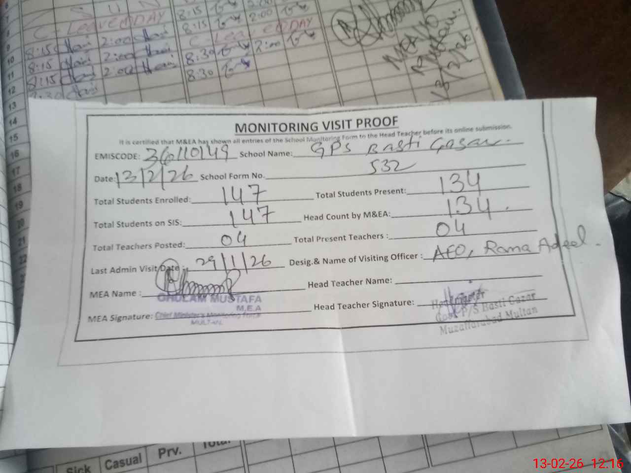 | Attendance Register | Head Teacher | MEA with School | Visit Proof |
