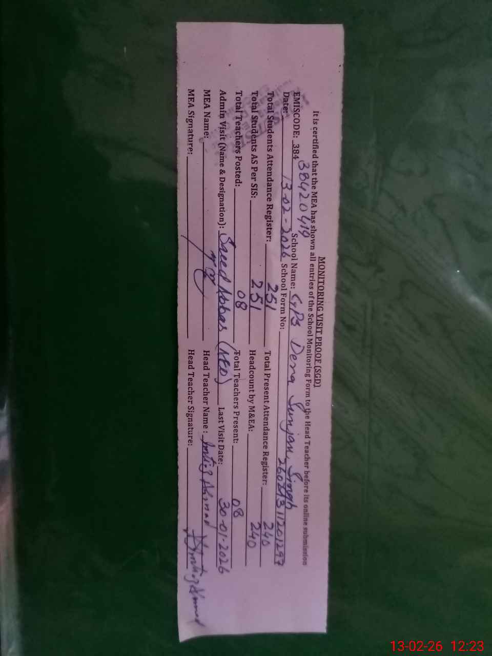 | Attendance Register | Head Teacher | MEA with School | Visit Proof |