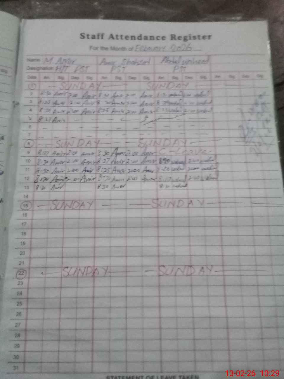 | CNIC | Full Name | Designation | R/C | Absence During Last Calender Month |