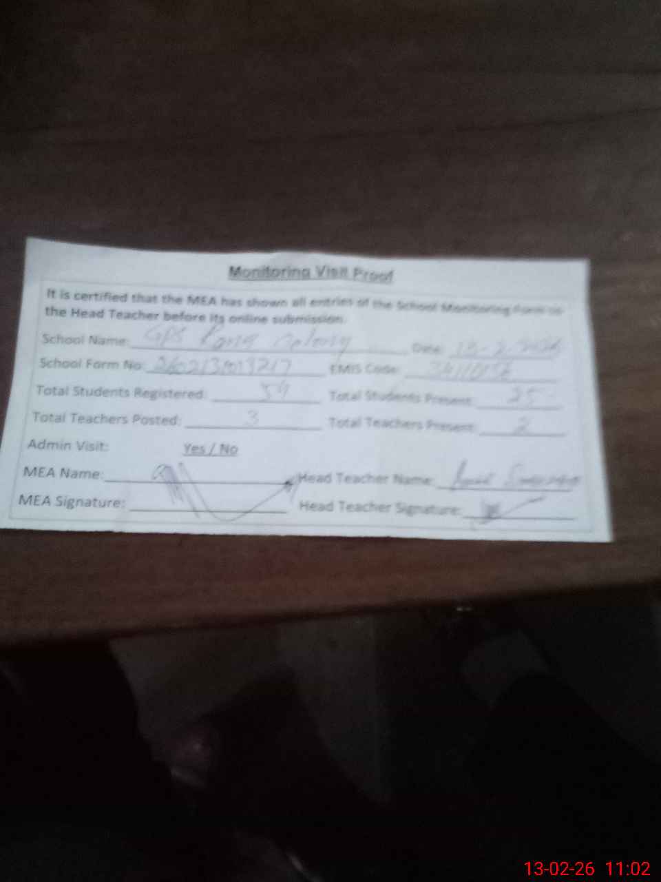 | Attendance Register | Head Teacher | MEA with School | Visit Proof |