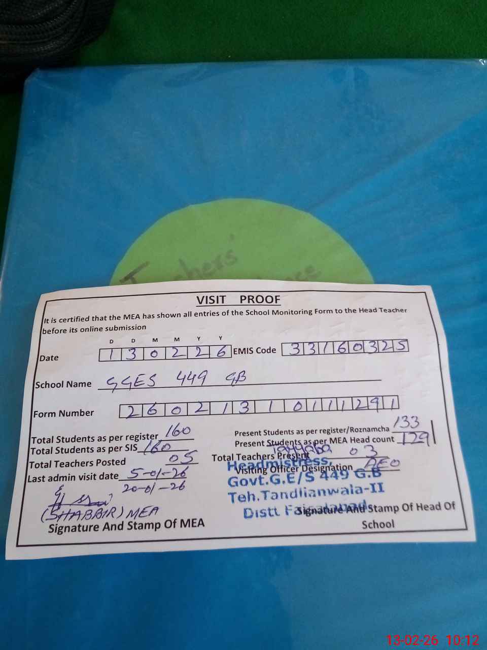 | Attendance Register | Head Teacher | MEA with School | Visit Proof |