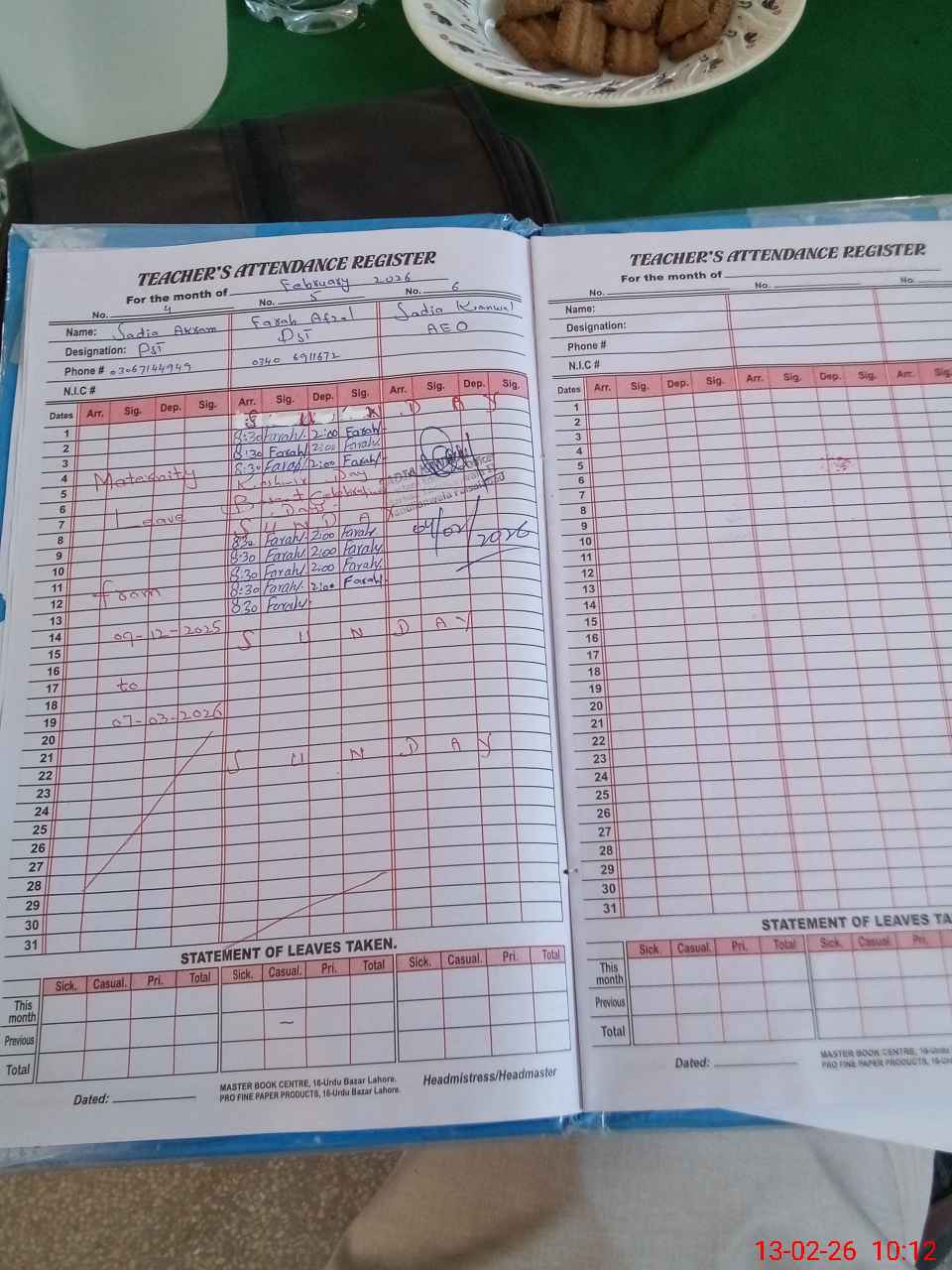 | Name: TA**** SH**** Designation: (School Headmaster's/Headmistress's) EST (GENERAL) Phone/Cell Number: 03**** |